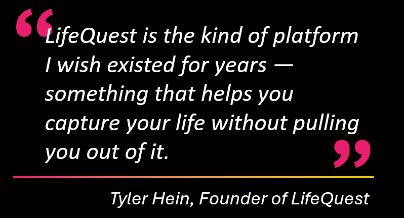 Tyler Hein is the founder of LifeQuest, a platform designed to help people document life more intentionally, reflect on their growth, and hold onto the moments that matter.